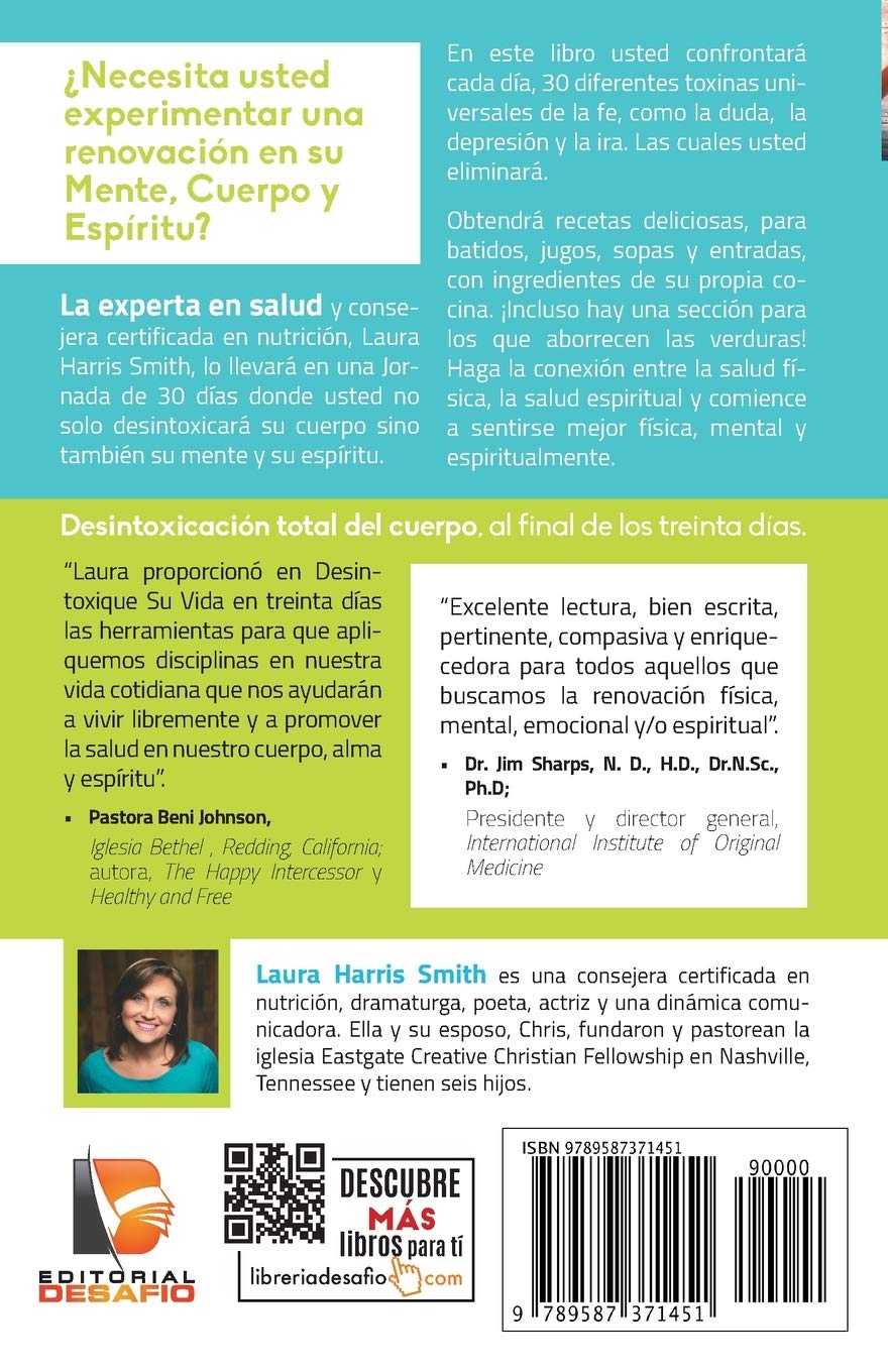 ¿Necesita usted experimentar una renovación en su Mente, Cuerpo y Espíritu? La experta en salud y consejera certificada en nutrición, Laura Harris Smith, lo llevará en una Jornada de 30 días donde usted no solo desintoxicará su cuerpo sino también su mente y su espíritu. En este libro usted confrontará cada día, 30 diferentes toxinas universales de la fe, como la duda, la depresión y la ira. Las cuales usted eliminará. Obtendrá recetas deliciosas, para batidos, jugos, sopas y entradas, con ingredientes de su propia cocina. ¡Incluso hay una sección para los que aborrecen las verduras! Haga la conexión entre la salud física, la salud espiritual y comience a sentirse mejor física, mental y espiritualmente. Desintoxicación total del cuerpo, al final de los treinta días.