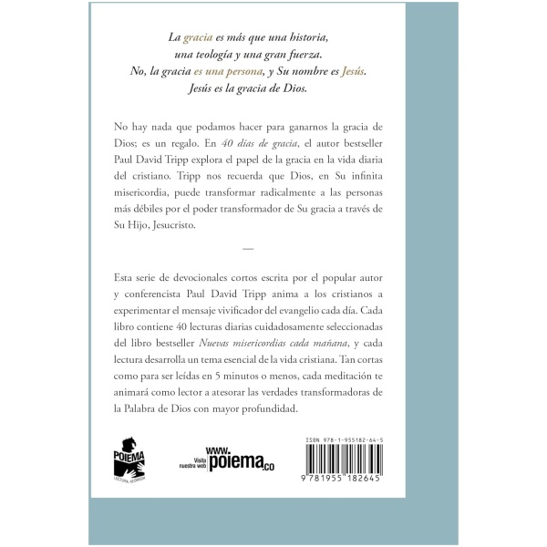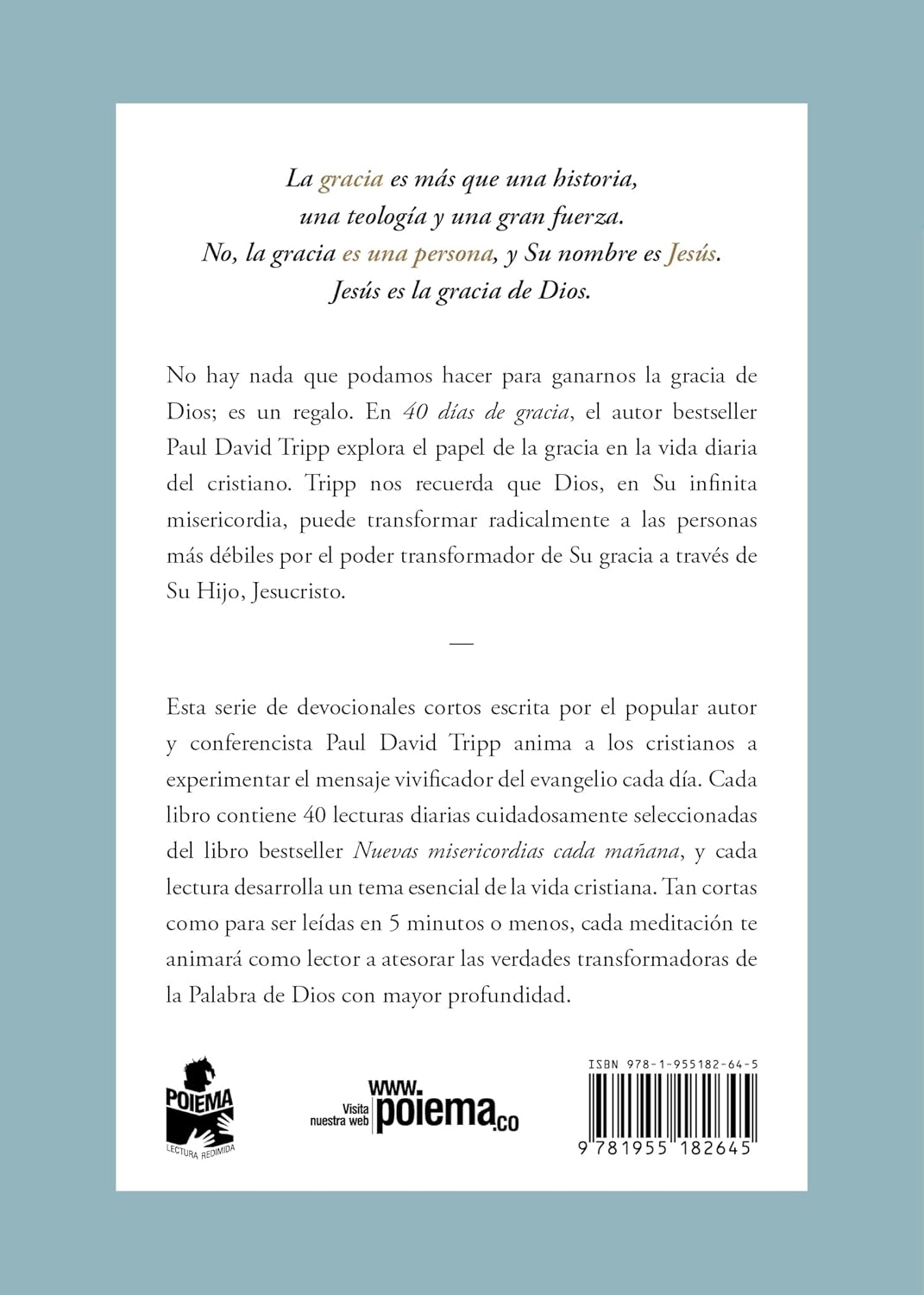 No hay nada que podamos hacer para ganarnos la gracia de Dios; es un regalo. En 40 días de gracia, el autor bestseller Paul David Tripp explora el papel de la gracia en la vida diaria del cristiano. Tripp nos recuerda que Dios, en Su infinita misericordia, puede transformar radicalmente a las personas más débiles por el poder transformador de Su gracia a través de Su Hijo, Jesucristo.