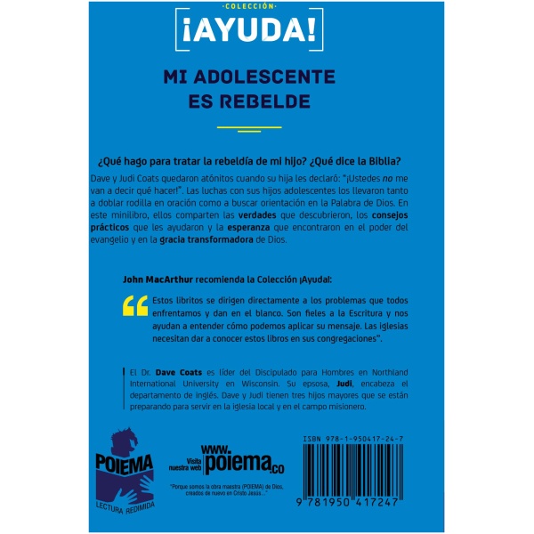 Dave y Judi Coats quedaron atónitos cuando su hija les declaró: “&¡excl;Ustedes no me van a decir qué hacer!”. Las luchas con sus hijos adolescentes los llevaron tanto a doblar rodilla en oración como a buscar orientación en la Palabra de Dios. En este minilibro, ellos comparten las verdades que descubrieron, los consejos prácticos que les ayudaron y la esperanza que encontraron en el poder del evangelio y en la gracia transformadora de Dios.