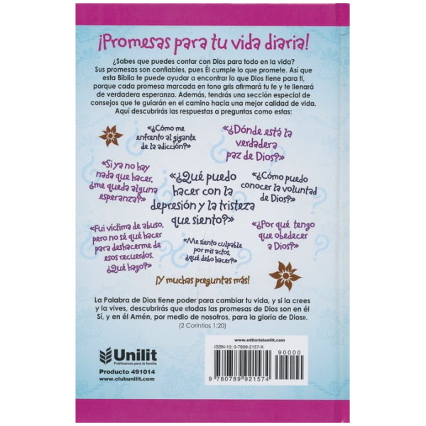 Biblia de Promesas, Reina-Valera 1960, Edición para Jóvenes, tapa dura a colorAutor: RVR1960ISBN: 9780789921574La Biblia Promesas: Edición para jóvenes, en la versión Reina-Valera 1960, te pone en contacto con Dios y sus respuestas para las situaciones de la vida. Sus promesas son confiables, pues Él cumple lo que promete. Así que esta Biblia te puede ayudar a encontrar lo que Dios tiene para ti, pues cada promesa marcada en tono gris afirmará tu fe y te llenará de verdadera esperanza.Características:Más de 1,800 promesas marcadas en tono gris.Sección de promesas por temas.Índice de promesas.Concordancia.Plan de Salvación: La Gran Promesa de Dios.Dimensiones: 19 x 13 cms Aprox.