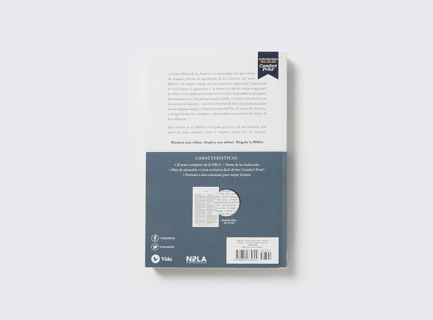 La NBLA es la palabra de Dios escrita en el lenguaje de tu corazón. ¡Descubre por qué la Biblia es el libro más vendido en la historia del mundo! El Texto de la NBLA es la forma perfecta de explorar la mayor obra literaria jamás escrita en una presentación económica ideal para evangelismo o regalar a aquella persona que necesita conocer el plan de salvación. El texto de la Nueva Biblia de las Américas retiene de manera precisa el significado de los idiomas originales, al mismo tiempo que provee claridad y legibilidad únicas. Respetando el mismo vocabulario, la gramática y la estructura de los originales, la Nueva Biblia de las Américas es la traducción moderna más literal disponible en español latinoamericano. Esta Biblia incluye: El texto completo de la NBLA Notas de la traducción Plan de salvación Letra exclusiva fácil de leer Comfort Print® 6.5 Formato a dos columnas para mejor lectura.