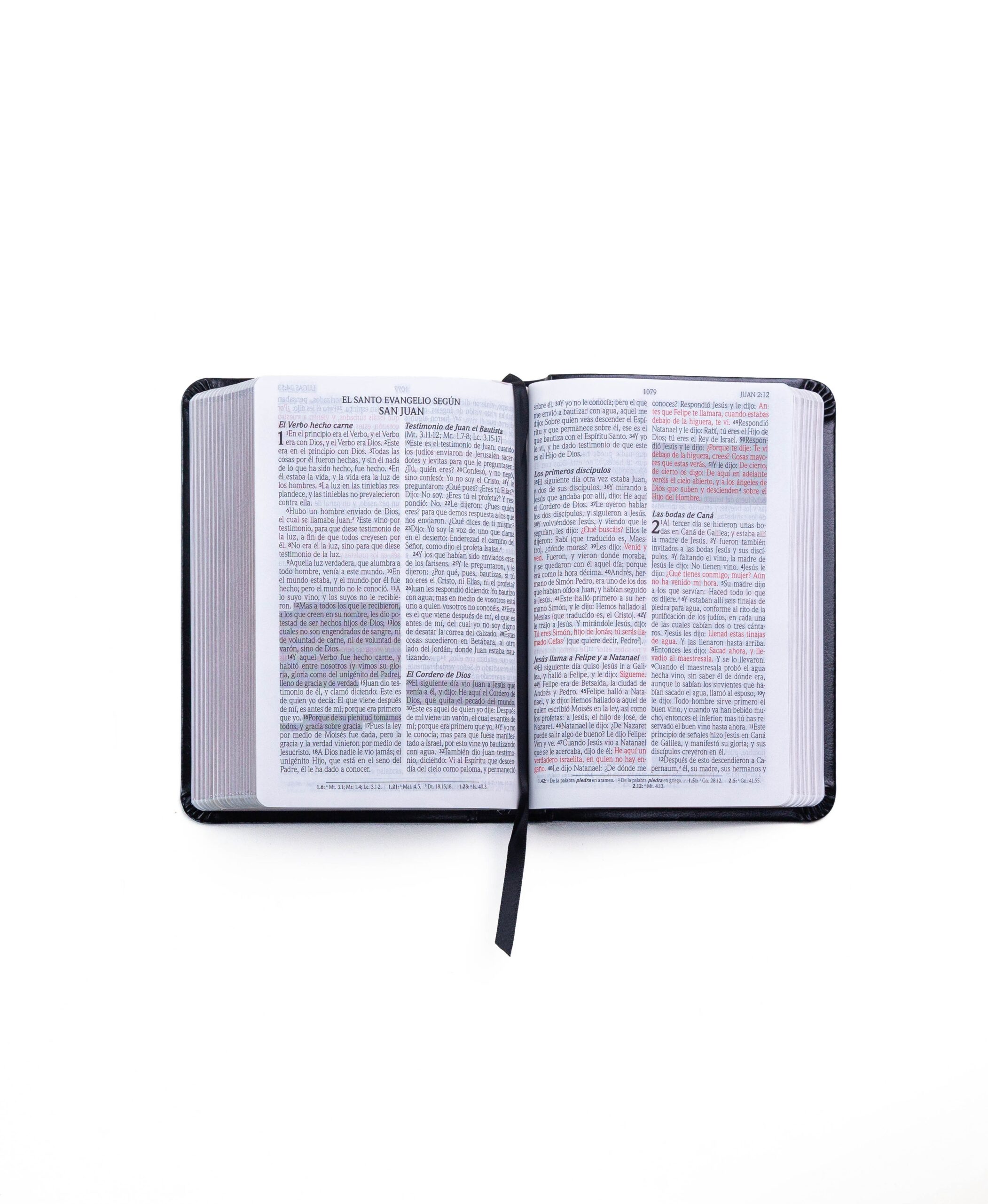 La edición Compacta de nuestra serie de Biblias de Promesas combina las ventajas de nuestra Biblia de letra gigante y de nuestra Biblia de tamaño manual en un tamaño más compacto. Perfecta para llevarla en un bolso o maletín dondequiera que vaya. Esta edición renovada completamente, incluye nueva tipografía, palabras de Jesús en rojo y un diseño más elegante y delgado. Contiene los beneficios de una Biblia de letra grande, en un tamaño compacto. Más de 1800 promesas marcadas en tono gris para un fácil reconocimiento Palabras de Jesús en rojo Referencias cruzadas Cinta marcadora Plan de salvación Sección de Promesas por tema Índice de promesas Concordancia Mapas