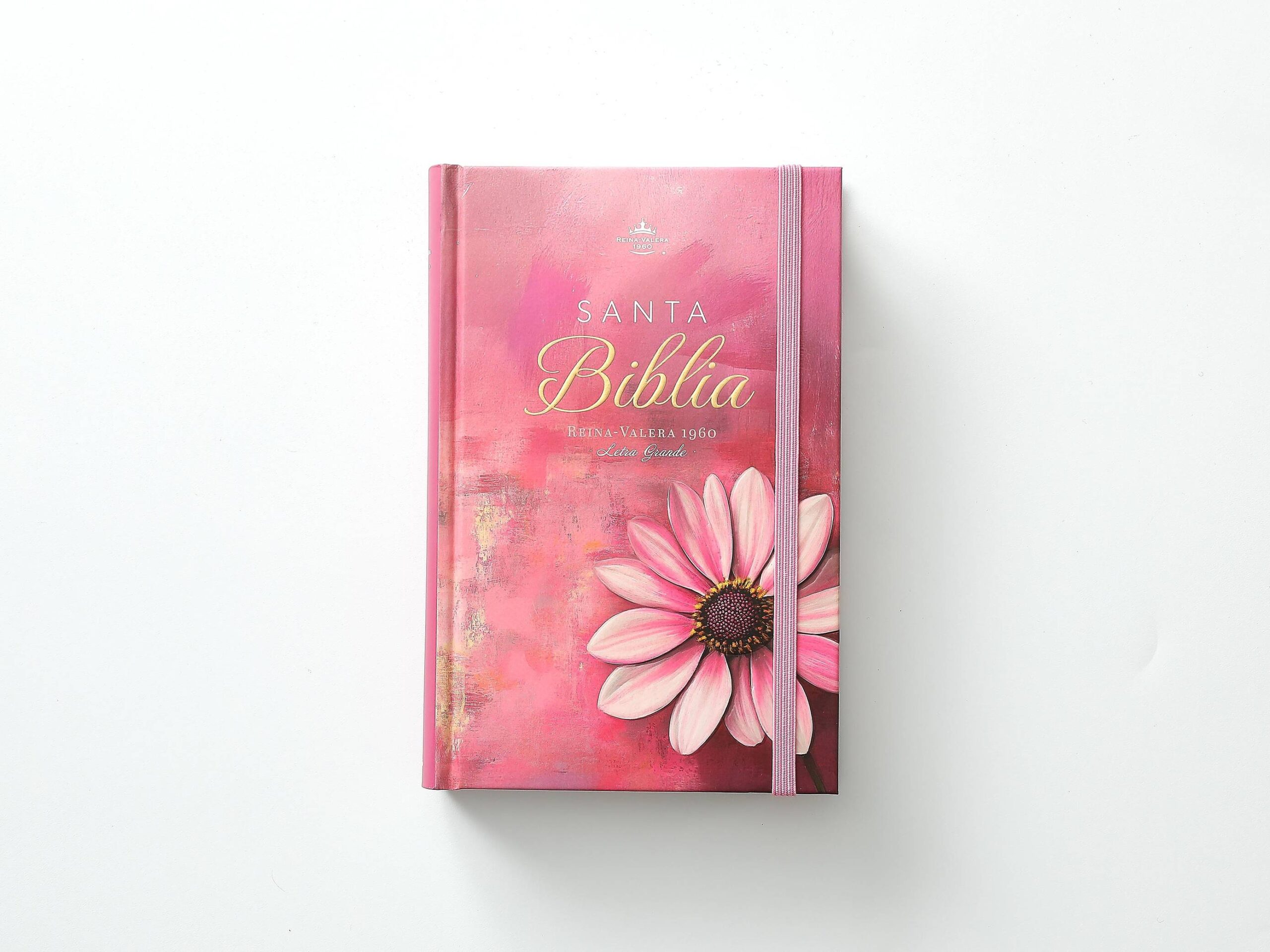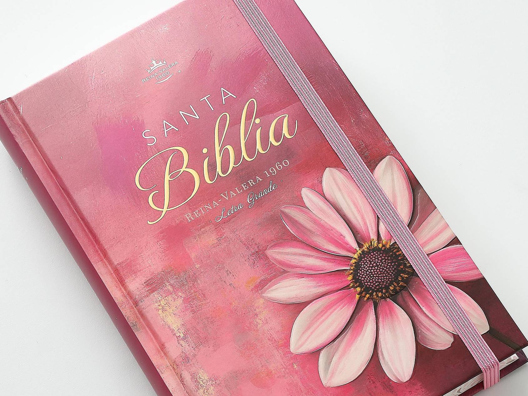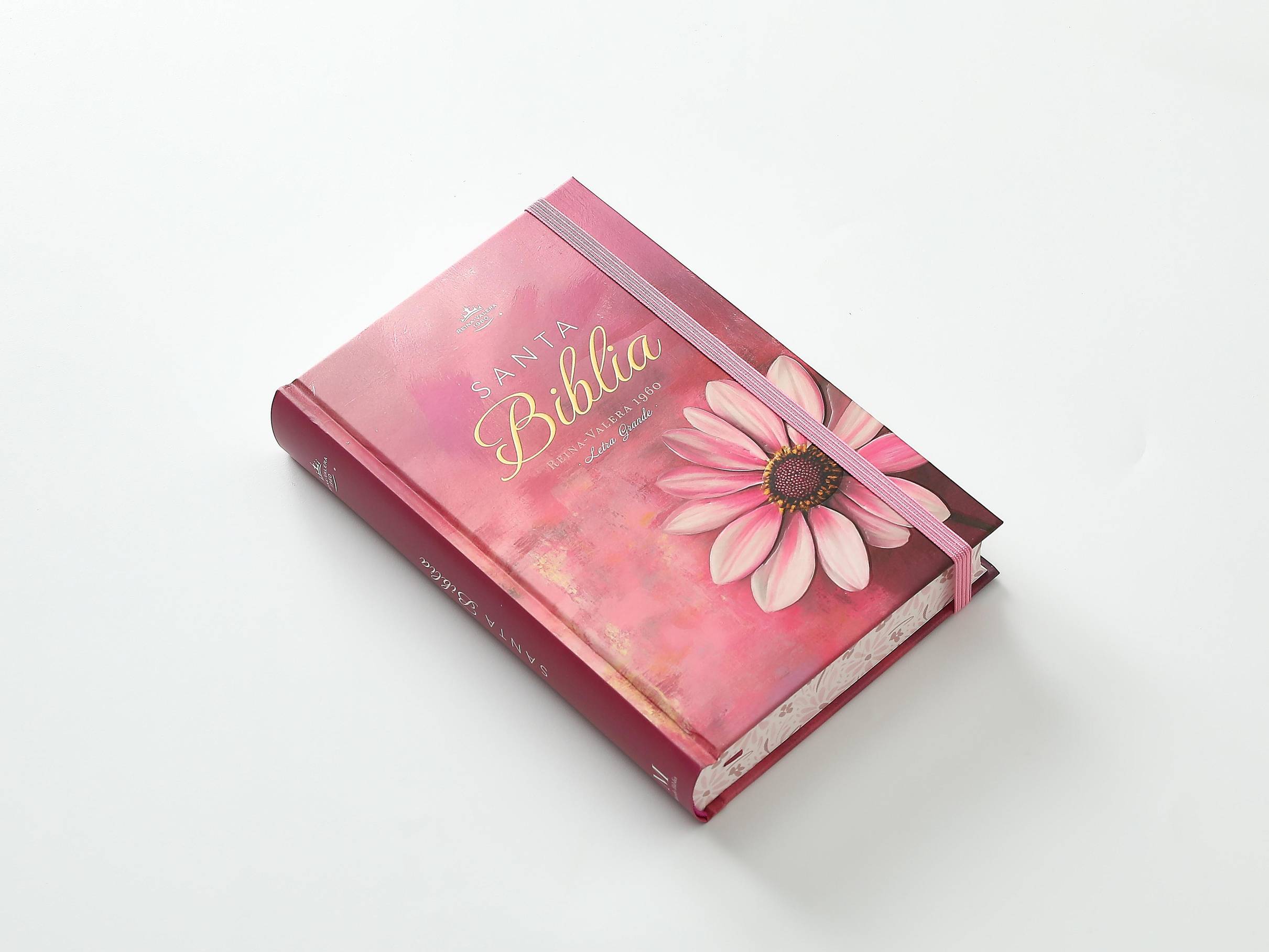 Biblia Reina Valera 1960 en formato de letra grande, ideal para lectura cómoda y prolongada. Presenta una elegante tapa dura con diseño floral en relieve en tonos rosa, que combina estética y durabilidad. Incluye elástico de cierre para proteger las páginas y canto pintado que realza su presentación. Las palabras de Jesús destacan en rojo para facilitar su identificación durante la lectura. Su tamaño manual la hace práctica para llevar a cualquier lugar, perfecta tanto para estudio devocional como para consulta diaria