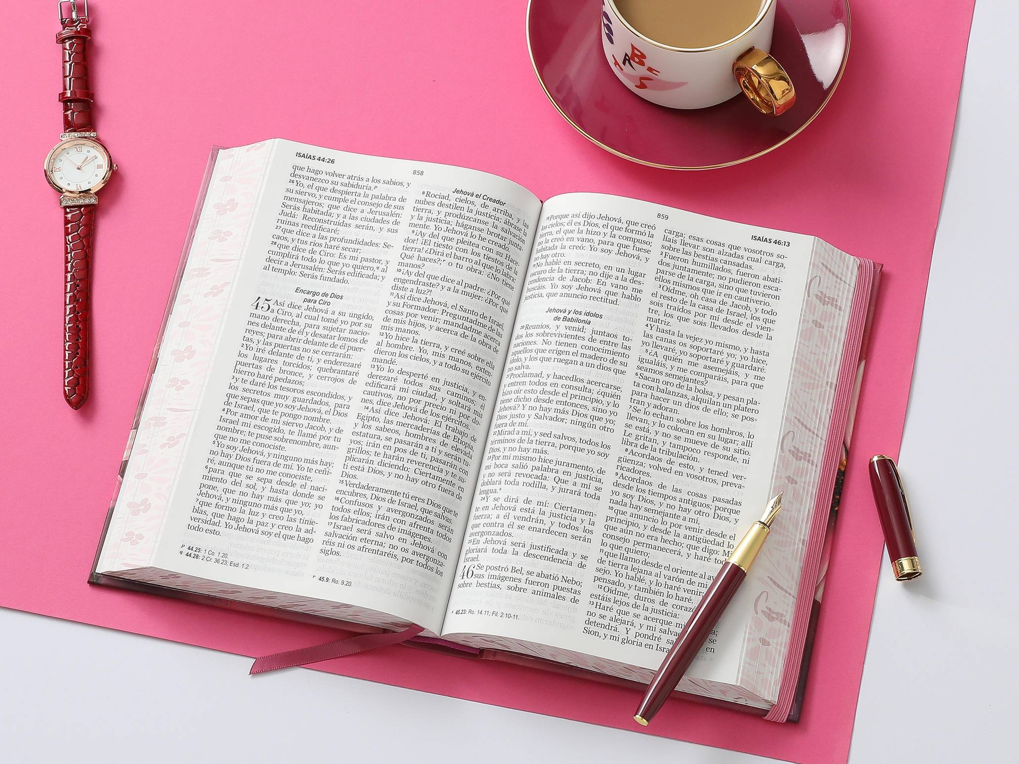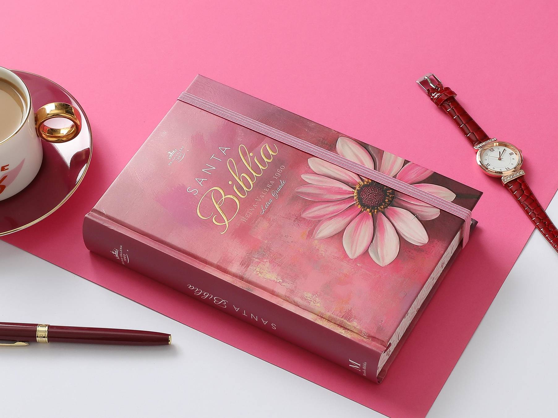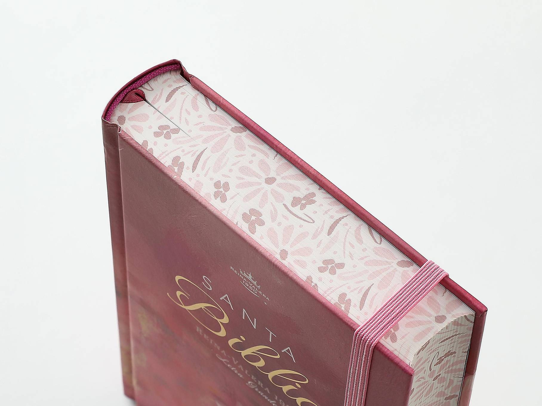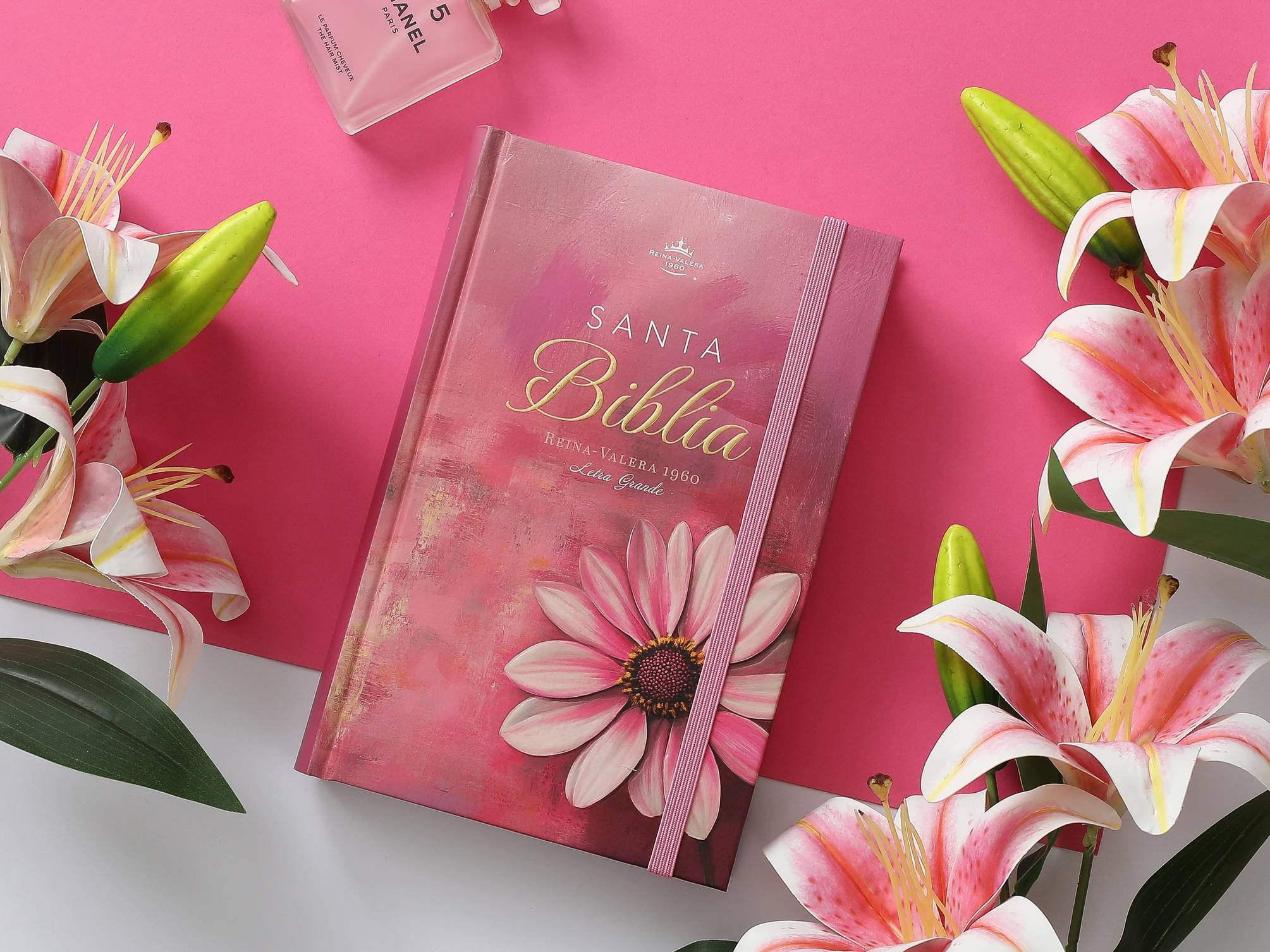 Biblia Reina Valera 1960 en formato de letra grande, ideal para lectura cómoda y prolongada. Presenta una elegante tapa dura con diseño floral en relieve en tonos rosa, que combina estética y durabilidad. Incluye elástico de cierre para proteger las páginas y canto pintado que realza su presentación. Las palabras de Jesús destacan en rojo para facilitar su identificación durante la lectura. Su tamaño manual la hace práctica para llevar a cualquier lugar, perfecta tanto para estudio devocional como para consulta diaria