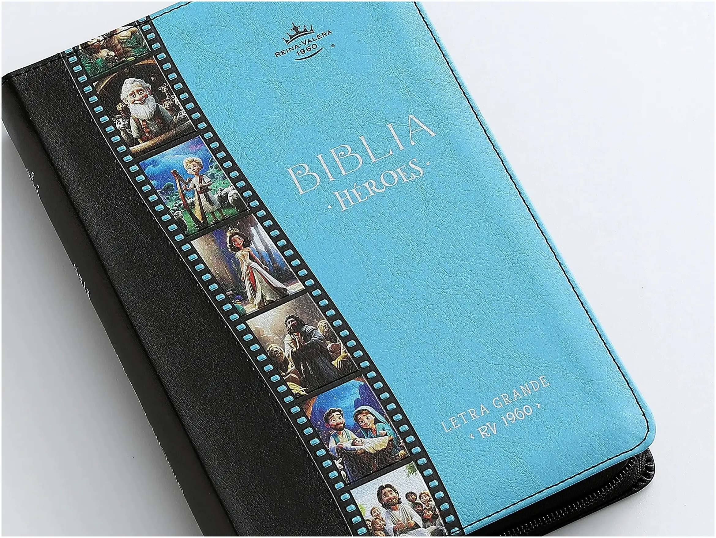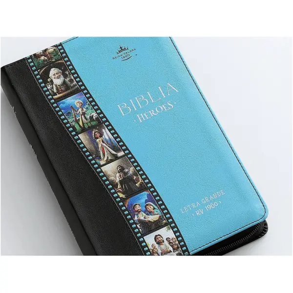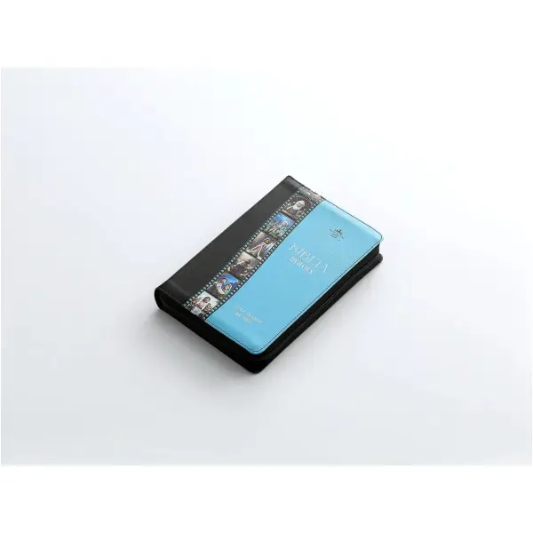 Reina Valera 1960, tamaño manual (138×212 mm), imitación piel bitono, con cierre, palabras de Jesús en rojo, concordancia , Concordancia de personajes bíblicos. ayudas, referencias cruzadas. 100 páginas a todo color intercaladas con imágenes en 3D de los principales personajes de la BIblia. 32 páginas a todo color con ayudas y esquemas. Plan de salvación. .Letra 12.5 puntos.