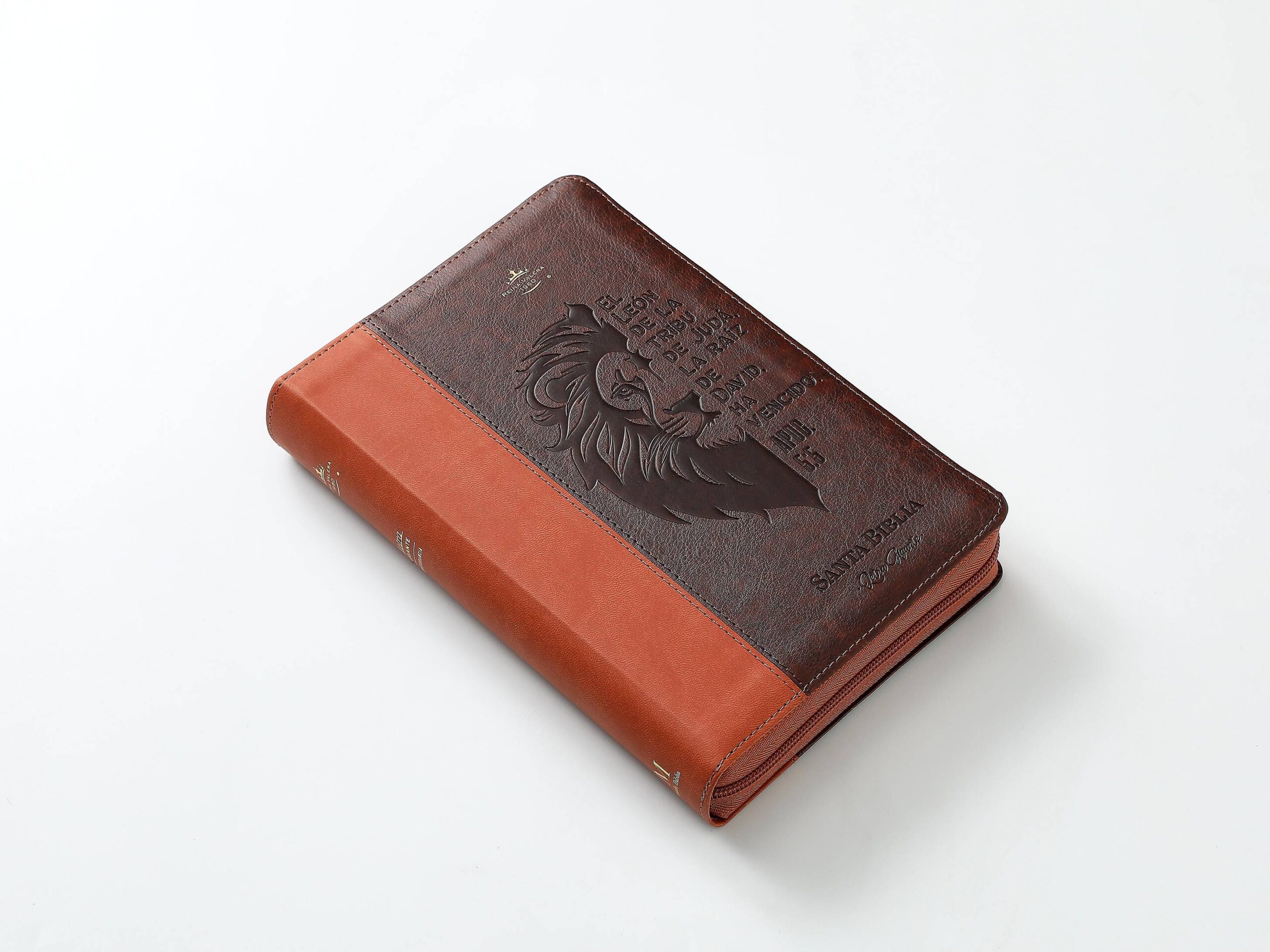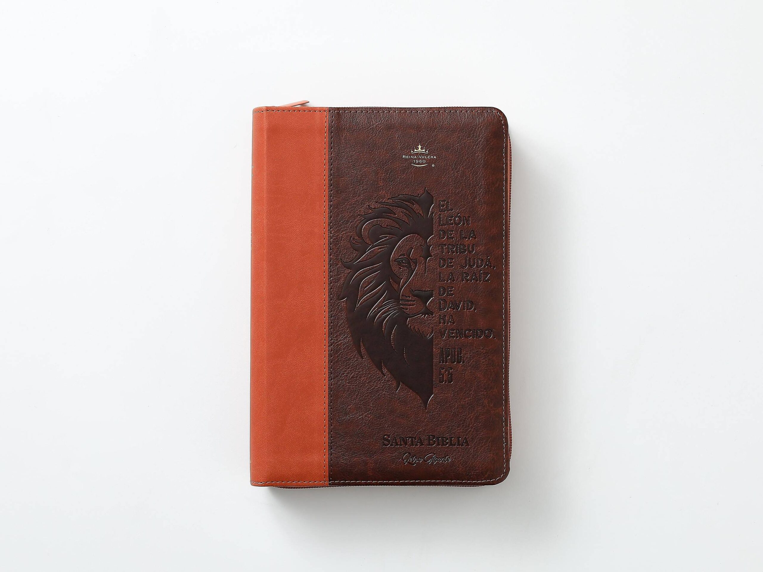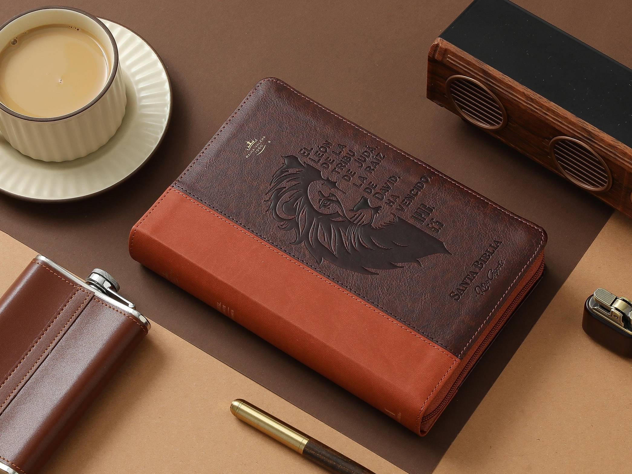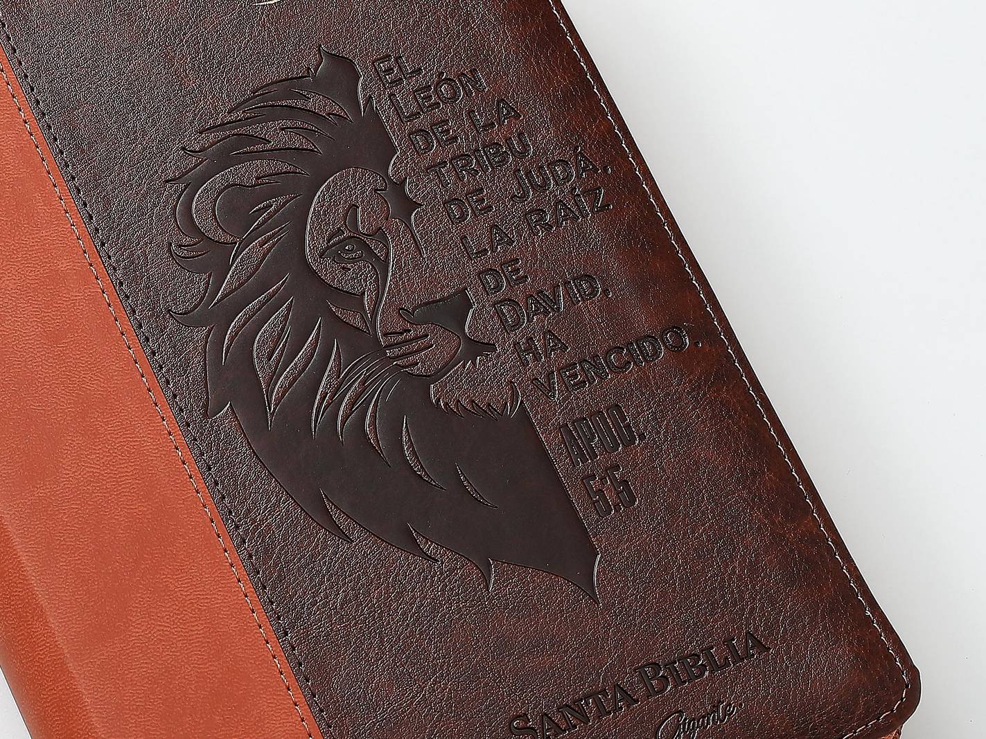 Biblia RVR 1960 con letra gigante de fácil lectura, ideal para quienes buscan comodidad visual durante el estudio bíblico. Encuadernación en imitación piel café con diseño de león, cantos dorados y cierre de seguridad. Características destacadas: palabras de Jesús en rojo, concordancia completa para referencias cruzadas, y presentación elegante. Perfecta para lectura devocional, estudio profundo o como regalo significativo. Durabilidad y funcionalidad en un volumen que combina tradición y practicidad.
