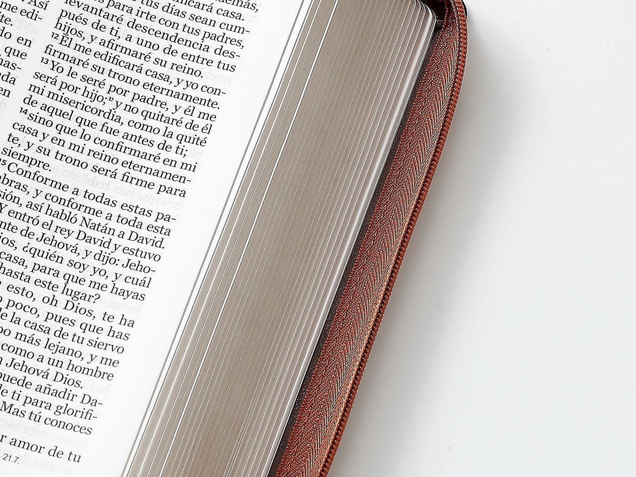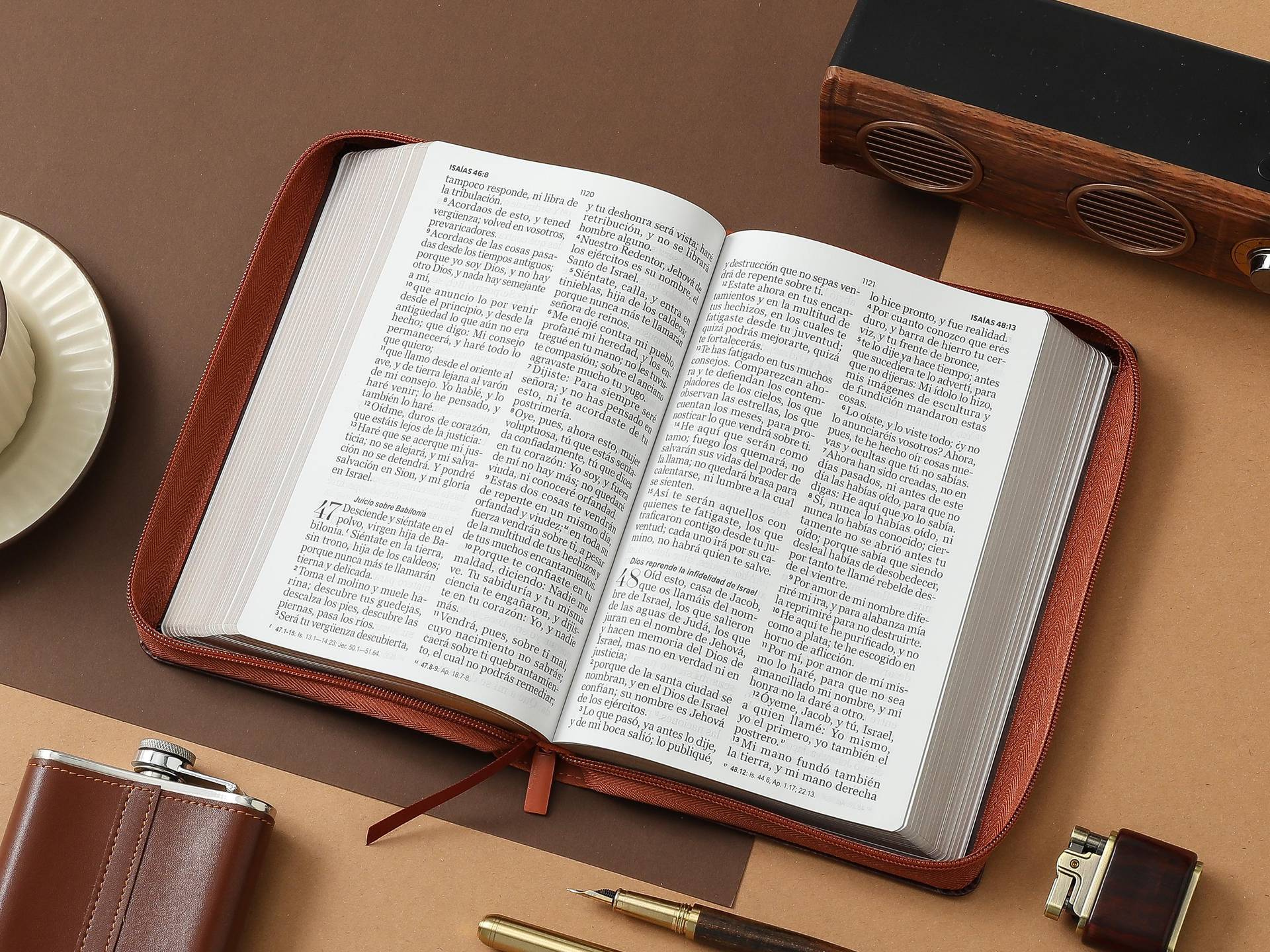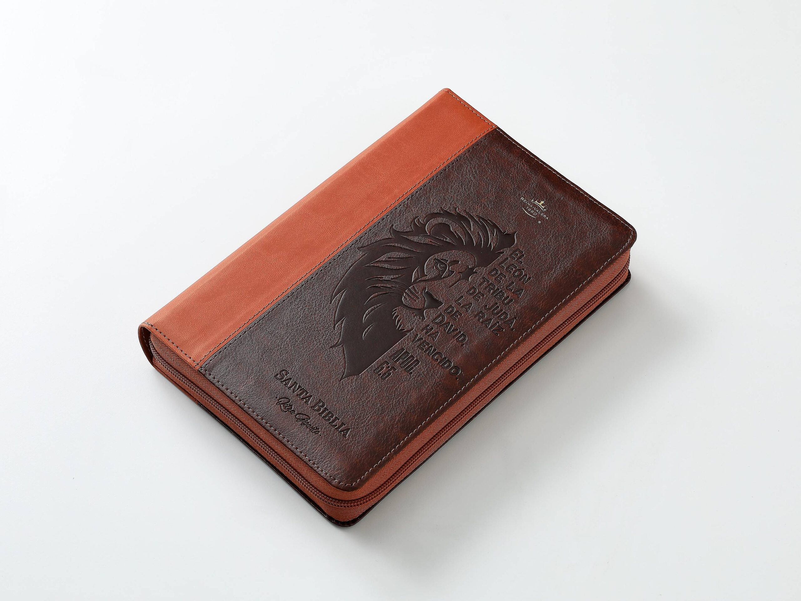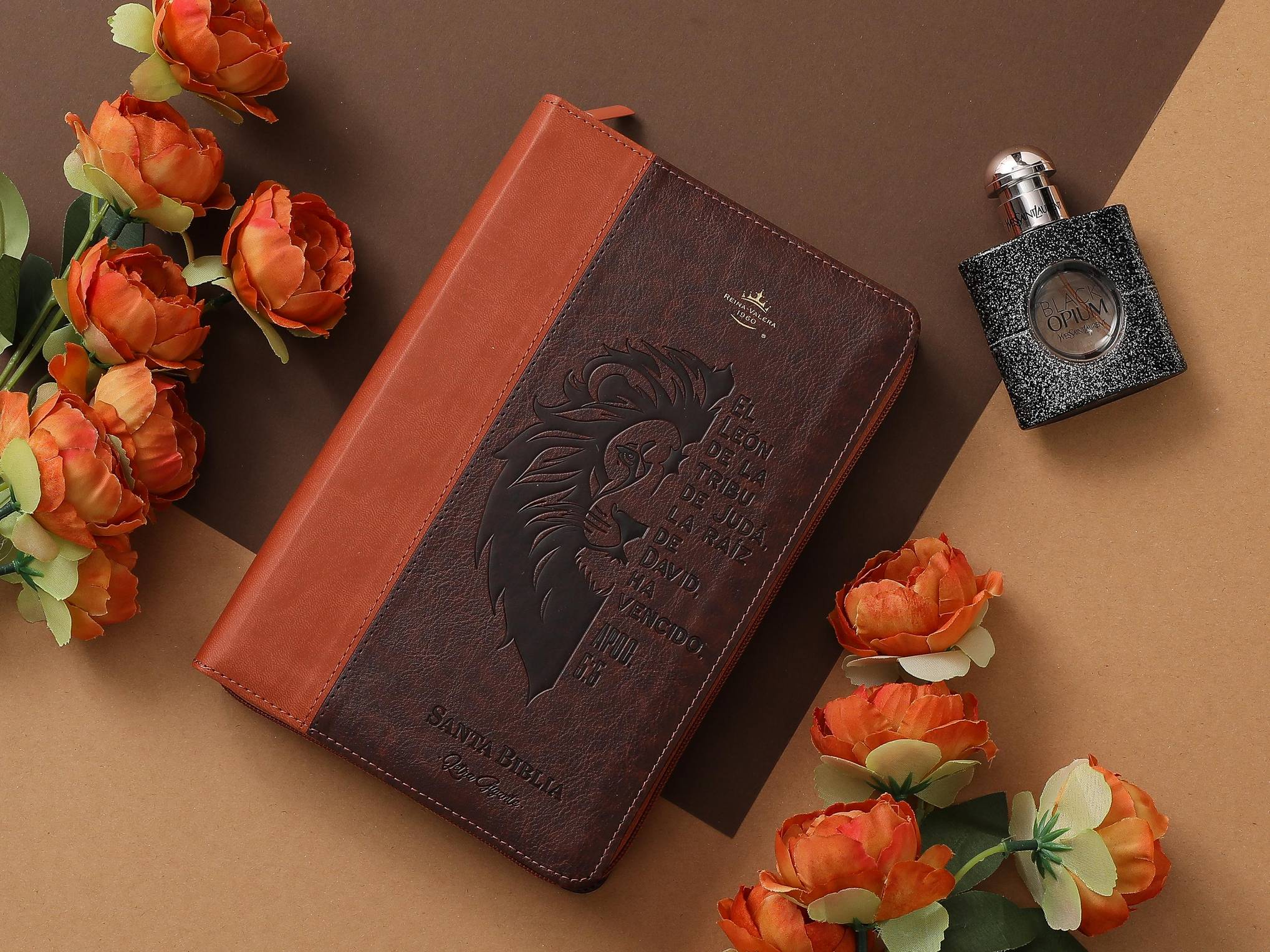 Biblia RVR 1960 con letra gigante de fácil lectura, ideal para quienes buscan comodidad visual durante el estudio bíblico. Encuadernación en imitación piel café con diseño de león, cantos dorados y cierre de seguridad. Características destacadas: palabras de Jesús en rojo, concordancia completa para referencias cruzadas, y presentación elegante. Perfecta para lectura devocional, estudio profundo o como regalo significativo. Durabilidad y funcionalidad en un volumen que combina tradición y practicidad.