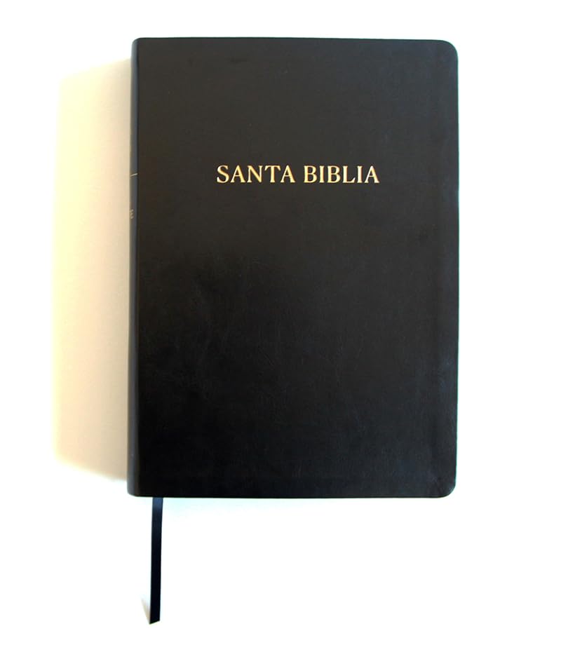Biblia tamaño grande, ultrafina y con letra super gigante. Piel negra con cinta marcadora y fotos a color de Tierra Santa.