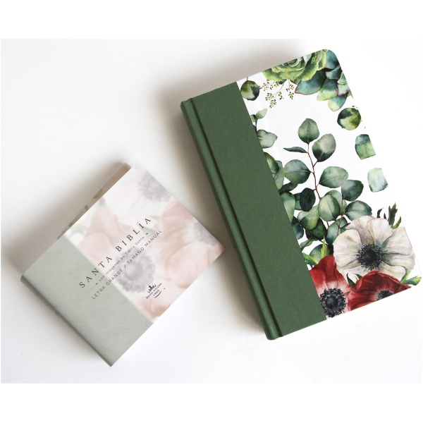 Biblia tamaño manual, ultrafina y con letra grande. Tapa dura con tela verde y flores, cinta marcadora y fotos a color de Tierra Santa.