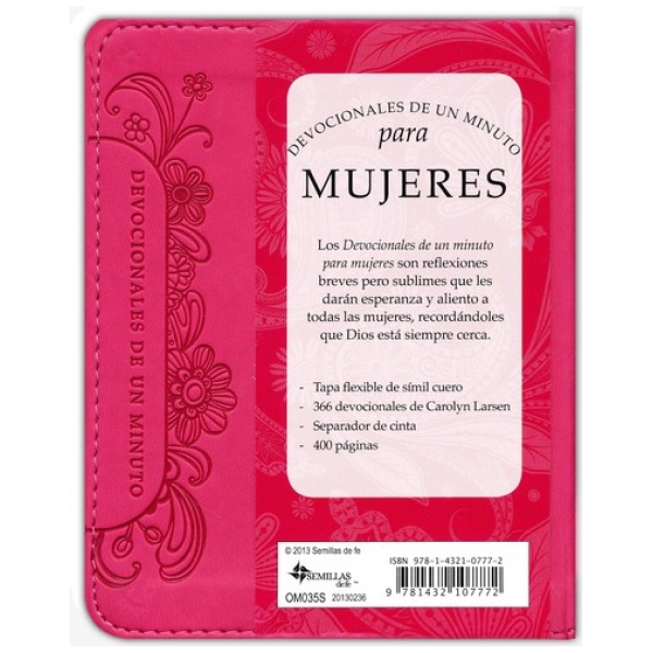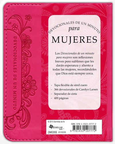Cada página de nuestro Devocional de un minuto para mujeres incluye una cita de las Escrituras y breve párrafo edificante, diseñado para animar. Es un tesoro para abrir cada día con diseño de portada invitador en imitación de cuero rosado con detalles grabados. Incluye página de presentación, acentos de página decorativos, y marcador de cinta de satín. 5.5″ x 4.5″, con cubierta acolchada. Palabras significativas de sabiduría para mujeres de la escritora cristiana ganadora de premios Carolyn Larsen.
