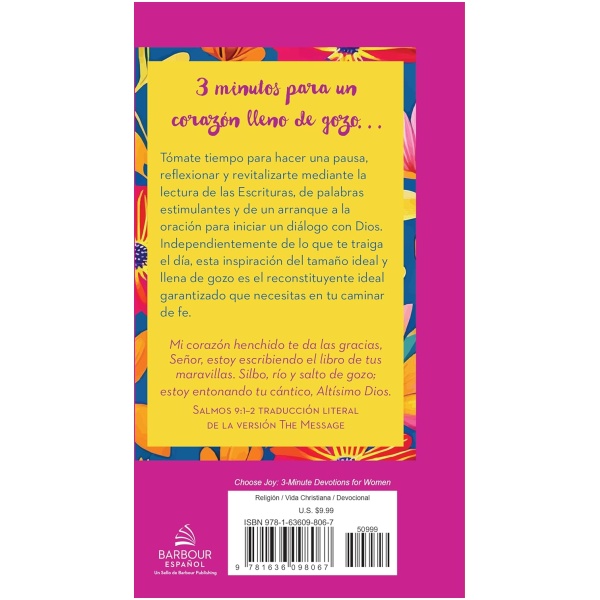 ¿Puedes sacar tres minutos? En Escoge el gozo: Devocionales de 3 minutos para mujeres las lectoras encontrarán el reconstituyente espiritual que desean. Escrito de manera especial para la mujer del siglo XXI, este maravilloso devocional contiene una poderosa dosis de consuelo, estímulo y gozo en sus lecturas de tamaño ideal. Primer minuto: versículos en los que meditar; segundo minuto: una breve lectura devocional; tercer minuto: una oración para impulsar una conversación con Dios. Esta manejable presentación es un regalo fantástico para todas las mujeres en cualquier ocasión.