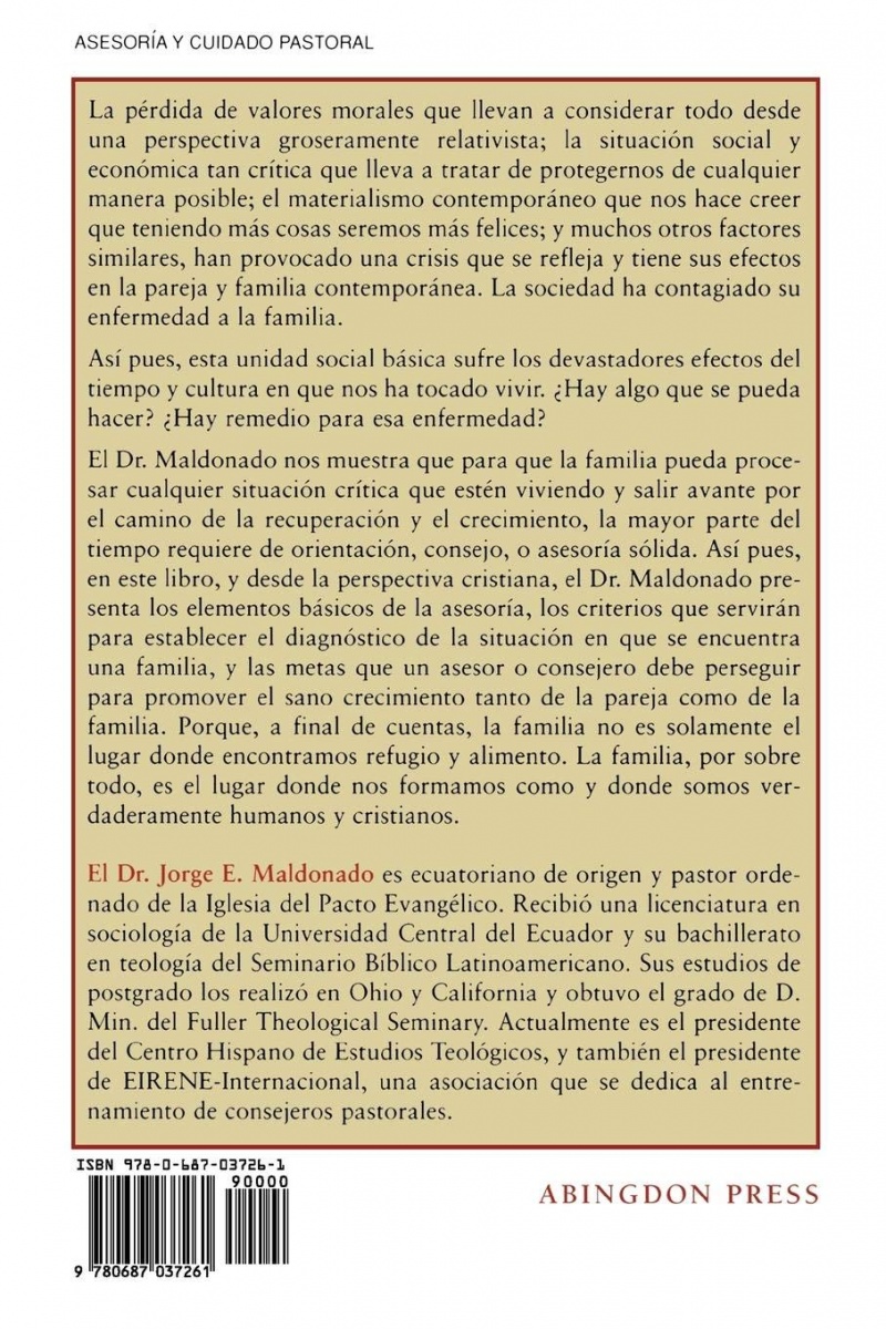 El Dr. Maldonado nos muestra que para que la familia pueda procesar cualquier situación crítica que estén viviendo y salir avante por el camino de la recuperación y el crecimiento, la mayor parte del tiempo requiere de orientación, consejo, o asesoría. Así pues, y desde la perspectiva cristiana, en este libro el Dr. Maldonado presenta los elementos básicos de la asesoría, los criterios que servirán para identificar a una familia sana e ir hacia ella, y las metas que se deben perseguir al asesorar y que servirán al asesor o consejero para promover el sano crecimiento tanto de la pareja como de la familia. Porque, a final de cuentas, la familia no es solamente el lugar donde encontramos refugio y alimento. La familia, por sobre todo, es el lugar donde nos formamos como y donde somos verdaderamente humanos y cristianos.