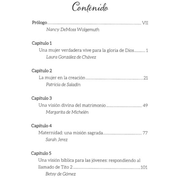 Las impulsoras del ministerio Aviva nuestros corazones y el movimiento Mujer verdadera han trabajado en equipo para desarrollar “el libro que debe leer toda mujer cristiana”. Bajo la orientación y la dirección editorial de Laura González y Nancy Leigh Demoss, las colaboradoras han procurado abordar las cuestiones esenciales de cada etapa en la vida de una mujer, para ayudarla a vivir de manera consagrada y llegar a ser una mujer verdadera independientemente de sus actuales circunstancias.