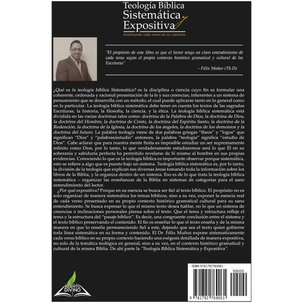 El Dr. Muñoz establece organizadamente la disciplina o ciencia bíblica con la finalidad de formular una coherente, ordenada y racional presentación de la fe y sus creencias, inherentes a un sistema con un método desarrollado, para una aplicación tanto en lo general como en lo particular. La inclinación del documento está basada en cuanto los textos de las sagradas Escrituras, la historia, la filosofía, la ciencia, y la ética. Dividiendo las doctrinas tales como: Bibliología, Teología, Antropología, Cristología, Pneumatología, Soteriología, Eclesiología, Angeología, Demoniología, Hamartiología y Escatología. Con este proyecto busca aclarar que para nuestra mente finita es imposible estudiar un ser supremamente infinito como Dios, por lo tanto, lo que verdaderamente se estudia es lo que Él en su soberanía y sabiduría perfecta ha permitido revelarse de Sí mismo al hombre en sus propias evidencias de manera sistemática. Su deseo es explicar las diversas áreas tomando toda la información sobre los libros de la Biblia, y organizándolo dentro de un sistema de categorías para el sano entendimiento del lector. ¿Por qué expositiva? Porque en su esencia se busca ser fiel al texto bíblico. El propósito no es solo organizar de manera sistemática los temas de las Escrituras, sino a su vez, exponer la esencia real de cada verso presentado en su propio contexto histórico gramatical cultural para su sano entendimiento. Expresa lo que el mismo texto desea hablar, no lo que un sistema de creencias o inclinaciones personales piensa sobre el texto. Que el tema y estructura refleje el tema y la estructura del “pasaje bíblico”. Es decir, una congruente conclusión entre el sistema y el texto preservando su contenido. El fin es enseñar lo que el texto enseña y de la misma manera en que lo enseña permaneciendo fiel a este, dejando que sea el texto quien gobierne toda línea sistemática en su forma y contenido.