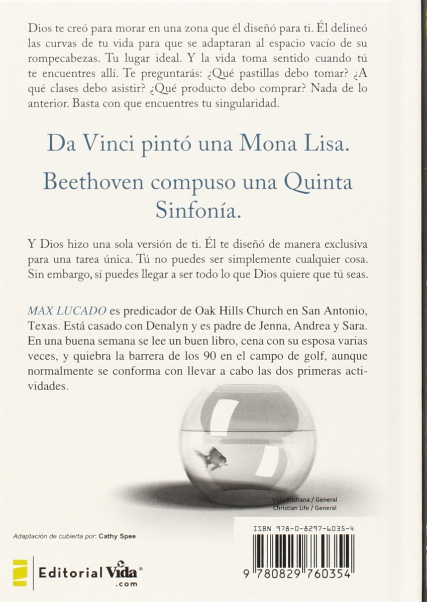 Dios hizo solo una versión de ti. Él te diseño para una tarea única. En el estilo que lo caracteriza, Max, captara tu atención, encenderá tu pasión por la vida y te dará un buen comienzo, basado en el plan de Dios para ti como un individuo único. Solo hay uno como tú y Dios te ha escogido para un tarea exclusiva. Puedes ser todo lo que Dios quiere que seas.